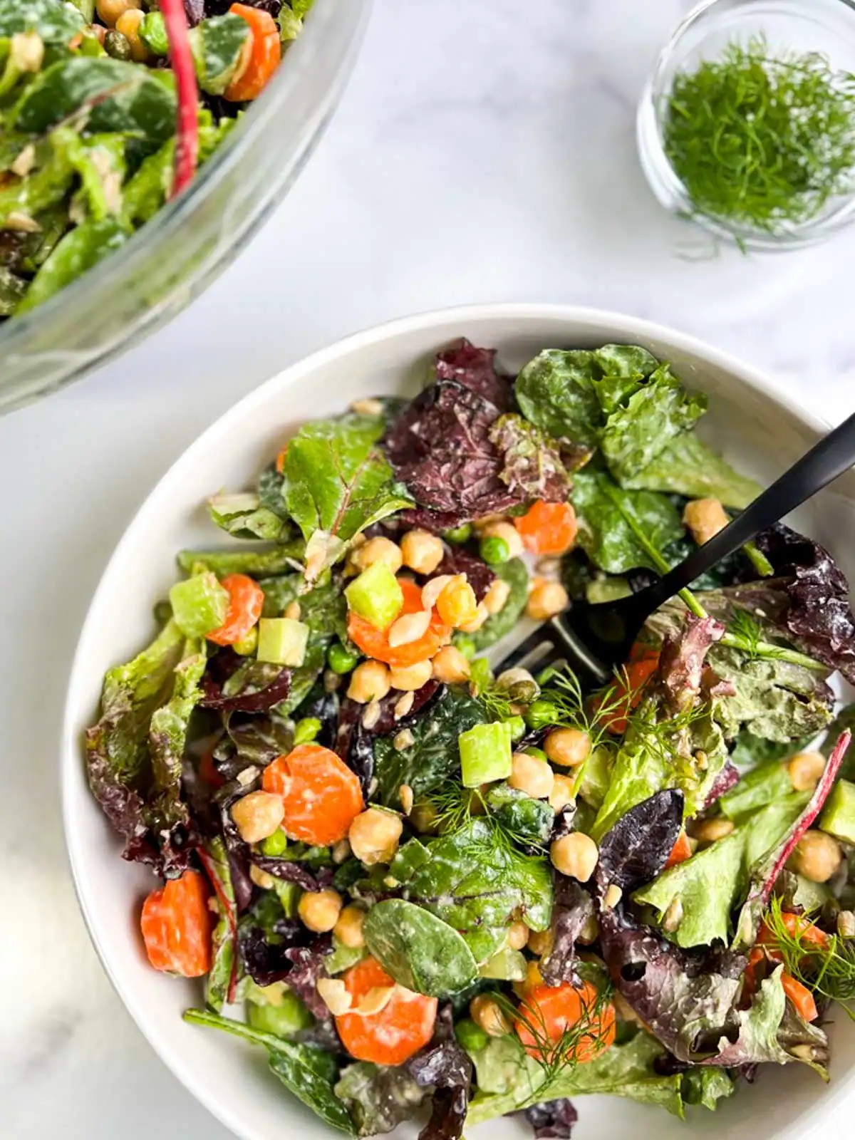 - Assemble the salad: Add the mixed greens, chickpeas, peas, celery, carrots, sunflower kernels, and capers to a large bowl.